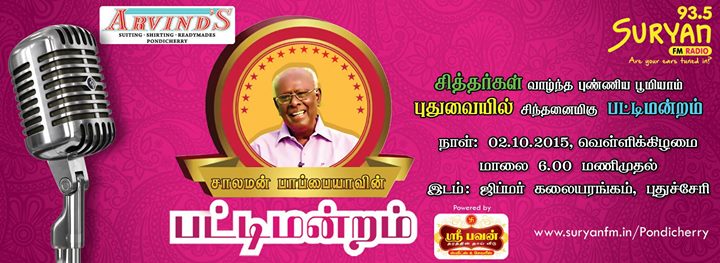 Via Facebook Solomon Paapaiya Pattimandram Karthikeyan : 02-10-2015 to 02-10-2015 : Jipmer Auditorium : 06:00 pm - 09:00 pm Rs : ~ Tweet Don't miss your Favourite event in Pondicherry! Get email notification on latest events. No spam, Try now! you can unsubscribe any time.