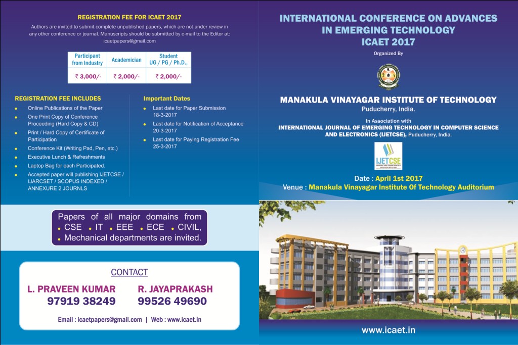 International Conference on Advances in Emerging Technology (ICAET 2017) is organized by Manakula Vinayagar Institute of Technology, Puducherry, India, in association with International Journal of Emerging Technology in Computer Science and Electronics (IJETCSE). The Conference an annual event organized by reputed Organization where researchers share their research outputs. It is a venue for discussion and exchange of ideas. It is where collaborative research partnerships are emerged. All Selected papers can also be published in IJETCSE and also Best Selected Papers will be forwarded and published in any of Scopus Journal / Annexure 2 Journal as extended publication.