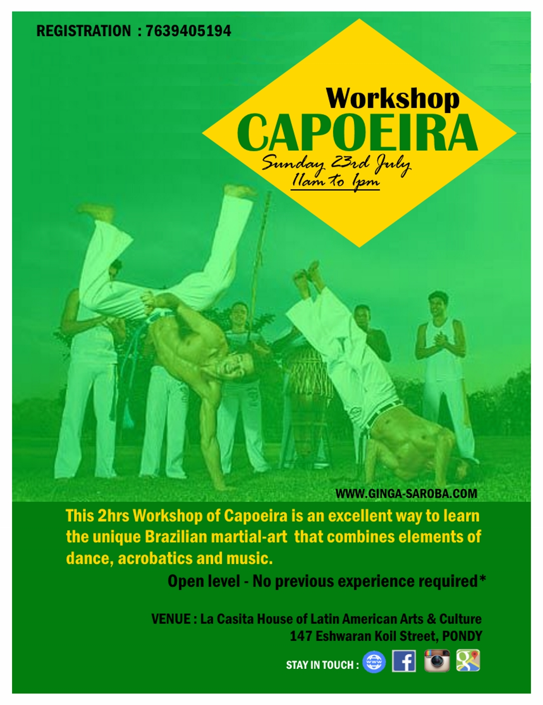 Ginga Saroba is a pioneer Capoeira group in South India. It was started by Prof. Samuka da Índia and his students, under the guidance & support of Mestre Branco (Ginga Nagô).