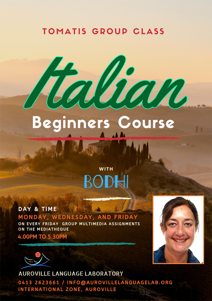 Italian Tomatis group Class ManoSathya : 15-07-2019 to 30-09-2019 : Auroville Language Lab : 04:00pm to 5:30pm Rs : 2100 : Education Tweet Don't miss your Favourite event in Pondicherry! Get email notification on latest events. No spam, Try now! you can unsubscribe any time.