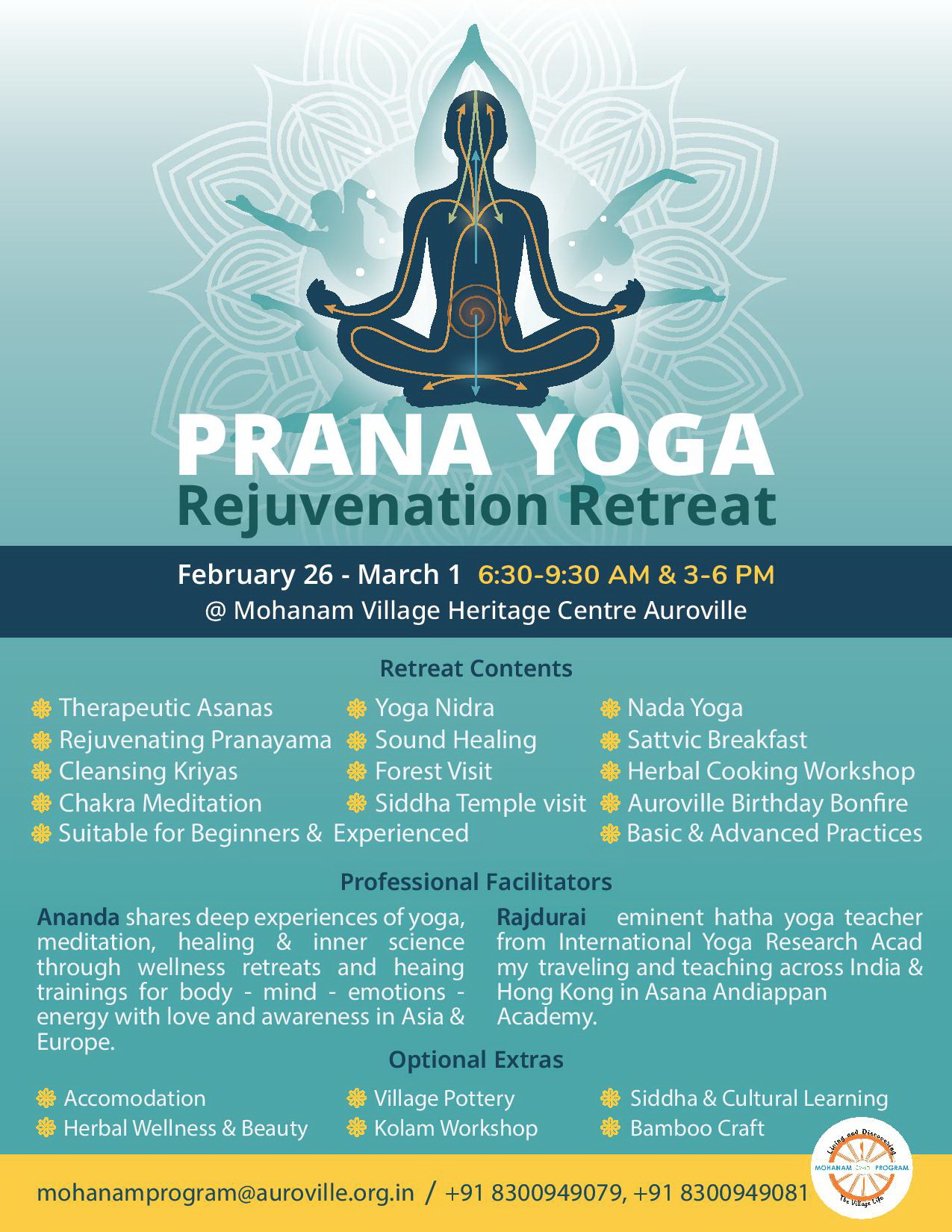 PRANA YOGA MohanamAuroville : 26-02-2020 to 01-03-2020 : Mohanam Village Heritage Centre : 6.30 am to 6 pm Rs : 9000 : Other Tweet Join with us for the PRANA YOGA Don't miss your Favourite event in Pondicherry! Get email notification on latest events. No spam, Try now! you can unsubscribe any time.